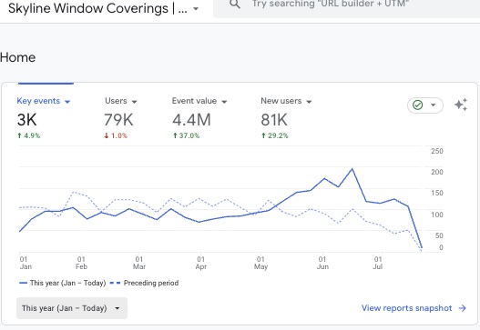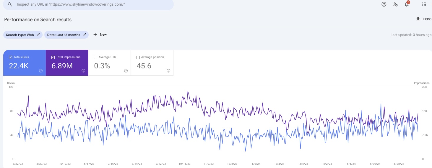 Skyline Window Coverings experienced a major drop in rankings, organic visibility, and conversions following the March 2024 Core Update and Helpful Content System release, largely due to duplicate content, sluggish page speed, broken links, and indexing bloat that prevented key product and location pages from performing. A nine-month SEO engagement valued at $2,500/month ($22,500 total) was structured into content strategy, on-page SEO, technical SEO (including URL restructuring and Core Web Vitals fixes), and link building/citations management, all tied to high-intent keyword targeting verified through SEMrush tracking. The campaign restored visibility and significantly improved results, including quadrupled appointment conversions and a +375% rise in AR conversion rate, while improving user engagement and lead quality through UX-focused changes.
