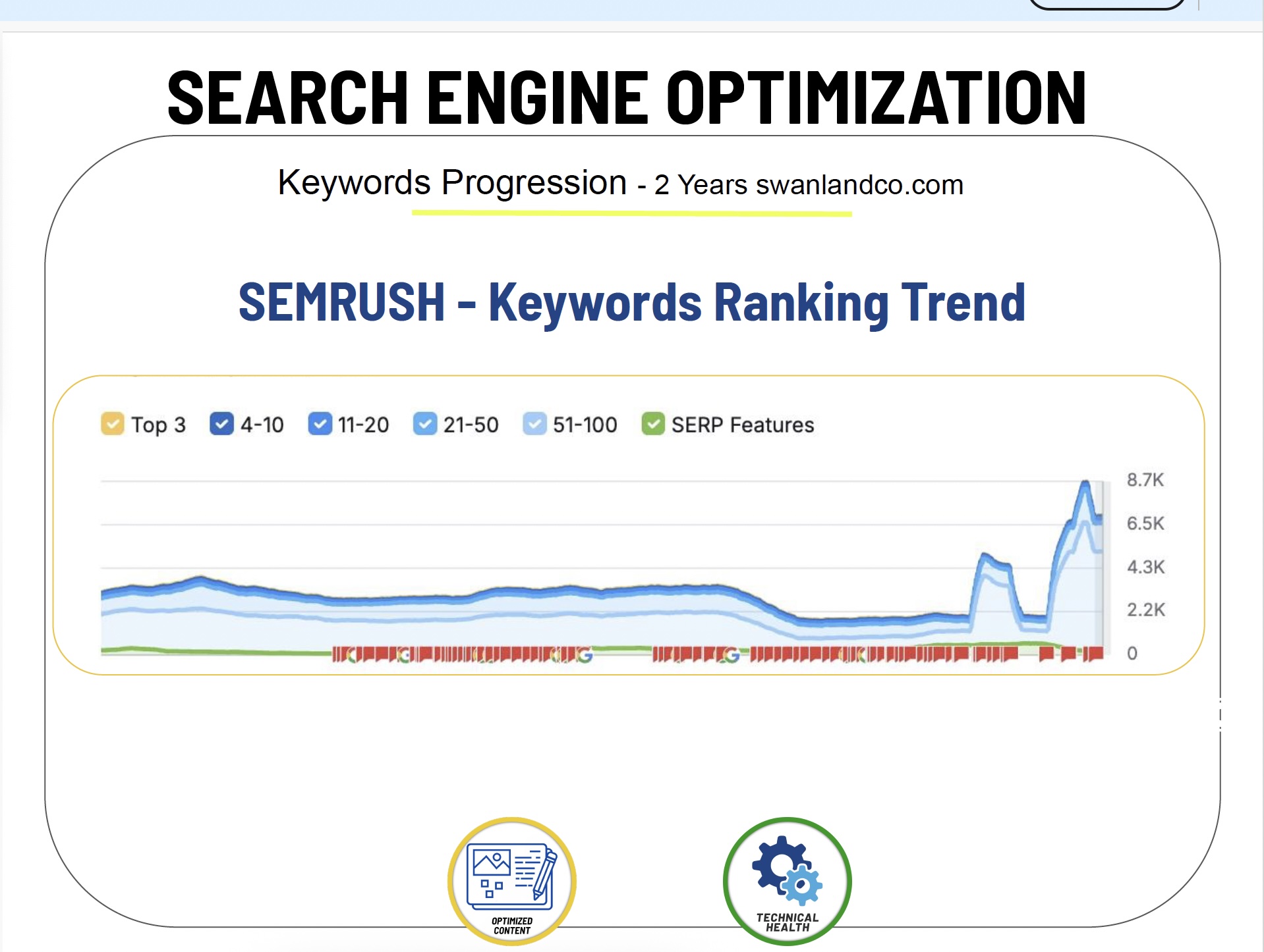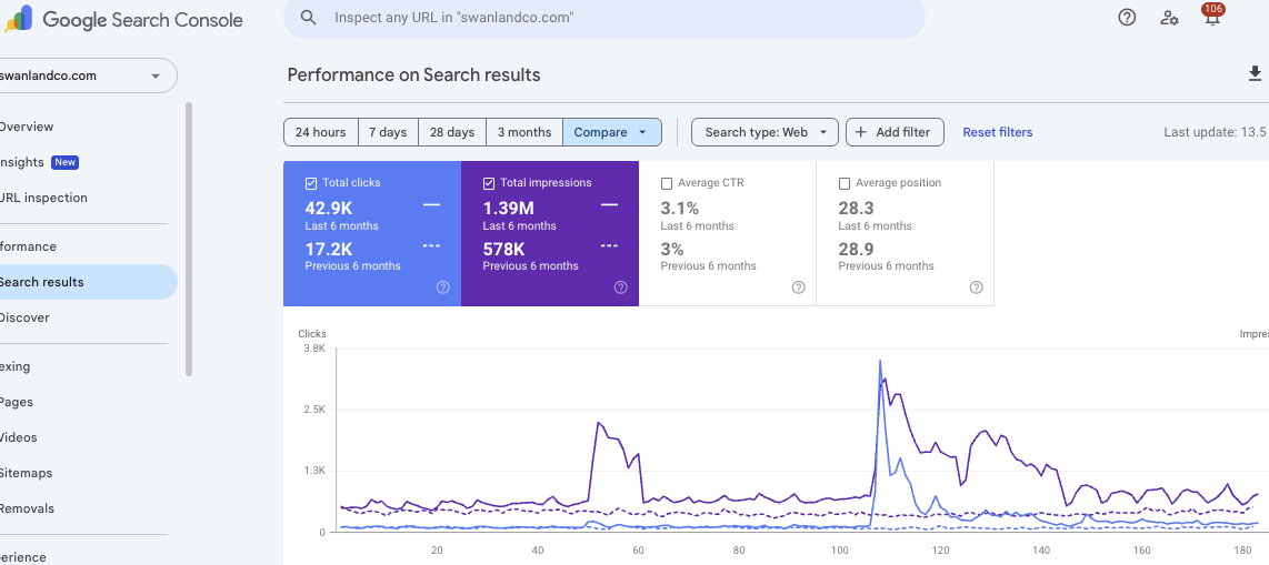 Over a focused six-month engagement, Swan Land Company partnered with me on a technical and content-led SEO transformation designed around content strategy, on-page SEO, page speed, URL restructuring, internal link building, video schema, and highly targeted Google Business Profile optimization and media post calendaring. By rebuilding metadata and topical architecture around high-value regional real-estate keywords—paired with structured data enhancements for property tours and ranch listings—we quadrupled organic keyword visibility and drove a massive leap in inquiries and engagement. Google Search Console data confirmed record traffic increases, with clicks rising from 17.2K to 42.9K (+149%) and impressions from 578K to 1.39M (+140%), marking the strongest search performance in the company’s 10-year history.